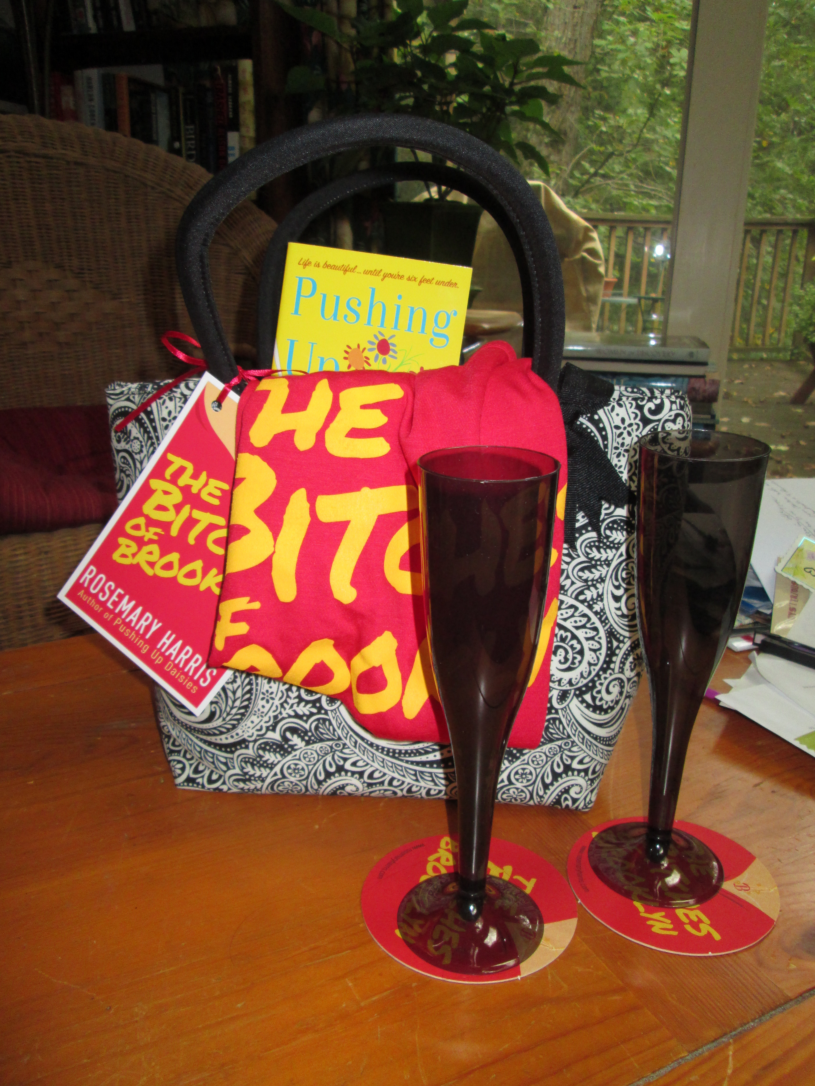 We have a special giveaway today, in addition to the book you could win a swag bag – an insulated tote with plastic champagne glasses and a bitches tank top. Just leave a comment below and an email to contact you.